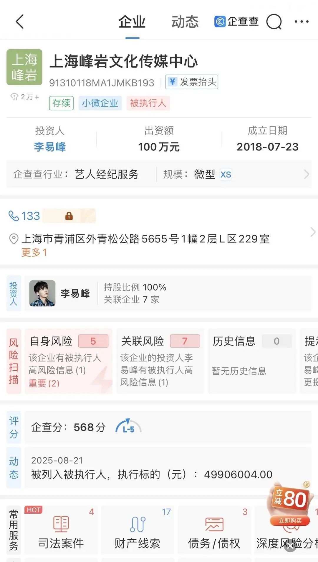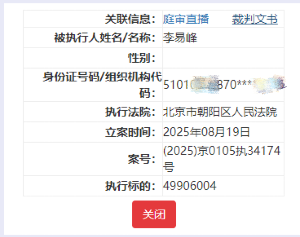 8月21日,李易峰被强制扩充4990万登上热搜,据悉,被扩充东说念主包括李易峰、李易峰名下公司、李易峰前经纪公司博众星和。据中国裁判布告网,2025年8月19日,李易峰、上海峰岩文化传媒中心、北京博众星和影视有限公司等被北京市向阳区东说念主民法院强制扩充约4990万元。其中,上海峰岩文化传媒中心建造于2018年7月,投资东说念主为李易峰,注册成本100万元东说念主民币,运筹帷幄规模包括组织文化艺术疏导行径、会议及展览干事、录像及视频制作干事等。
