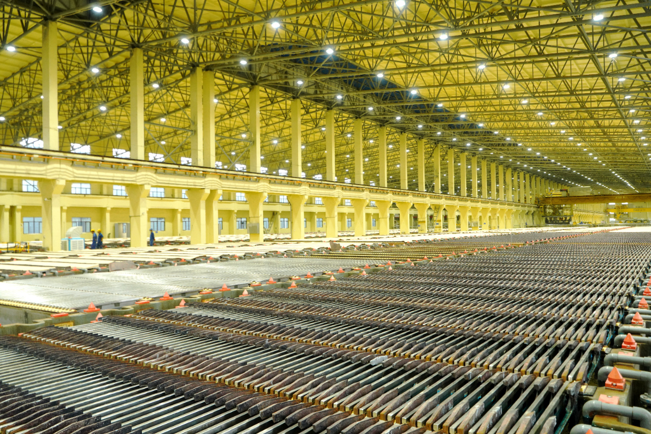 极新出炉的阳极板在自动智能整形系统内完成压平、铣耳等一系列处理后,由RGV智能小车转运到电解班的电解系统,经自动排板后由无东谈主行车吊装入电解槽。槽中阴极板历经10日千里淀,剥片机器东谈主进行剥离处理,并送至智能铜库。